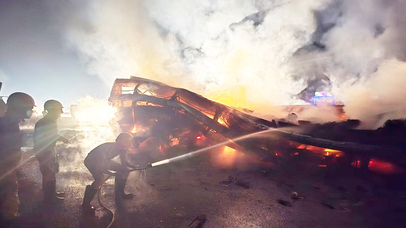 கர்நாடகம் மாநிலம், பெங்களூருவில் படுக்கை வசதி கொண்ட தனியார் சொகுசு பஸ் ஒன்று, 32 பயணிகளுடன் கோகர்ணாவுக்கு சென்று கொண்டிருந்தது. இன்று அதிகாலை சித்ரதுர்கா அருகே தேசிய நெடுஞ்சாலையில் சென்று கொண்டிருந்தபோது எதிர் திசையில் அதிவேகத்தில் வந்த கன்டெய்னர் லாரி, ஓட்டுநரின் கட்டுப்பாட்டை இழந்து, சாலை நடுவில் உள்ள தடுப்புச்சுவரில் மோதி தாண்டி வந்து பஸ் மீது வேகமாக மோதி விபத்துக்குள்ளானது. இந்த விபத்தில் லாரி, பஸ் தீப்பிடித்து எரிய தொடங்கியது. துரதிர்ஷ்டவசமாக பஸ்சுக்குள் சிக்கி இருந்த பலரால் வெளியே வர முடியாத சூழல் ஏற்பட்டுள்ளது. விபத்து சம்பவம் தெரியாமல் பஸ்சில் தூங்கிக்கொண்டிருந்தவர்களின் 20 பேர் பஸ்சிலேயே உடல் கருகி உயிரிழந்தனர்.