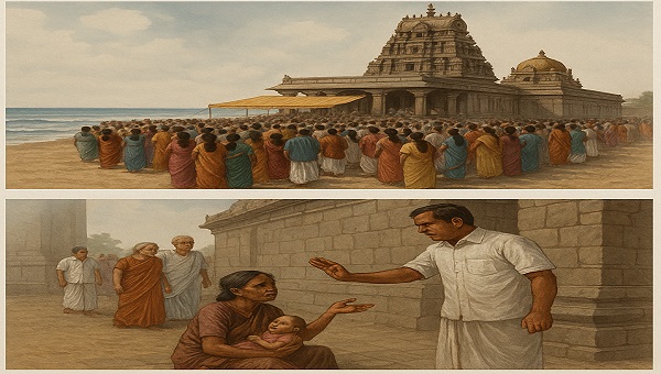 என்று நினைத்துக் கொண்டிருந்தார்கள். சரி, இந்தக் கூட்டத்திற்குள் நாம் சென்றால், நம்மை ஏதும் திட்டி விடுவார்களோ? என்று பயந்தனர் யாசகர்கள் . அதையும் மீறி அந்த ஒரு மாற்றுத்திறனாளிப் பெண் தன் கைக் குழந்தையுடன் யாசகம் கேட்க, குட முழுக்கு விழா நடக்கும் இடத்திற்குச் சென்றாள். இதைப் பார்த்த அந்தக் கோயிலின் தர்மகர்த்தா
