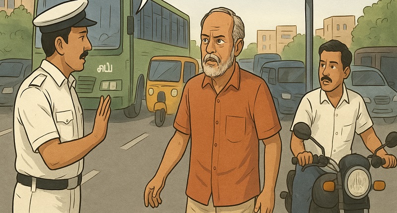” ஐயா, இப்ப பாருங்க” என்று அந்தப் போக்குவரத்து காவலர் சொல்ல ,திரும்பிப் பார்த்தார், அந்தப் பெரியவர்.
