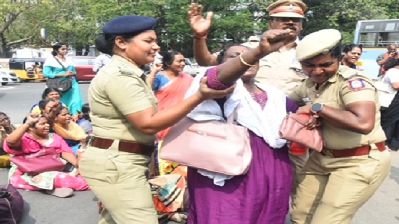 சம வேலைக்கு சம ஊதியம் வழங்கக்கோரி பதாகைகளை ஏந்தியபடி, முழக்கமிட்டனர். போராட்டம் நடத்தியவர்களை போலீசார் வலுக்கட்டாயமாக இழுத்துச் சென்று கைது செய்து அரசு பஸ்சில் ஏற்றி அருகில் உள்ள மண்டபத்தில் தங்க வைத்தனர். இதனால் அப்பகுதியில் சிறிது நேரம் பரபரப்பு ஏற்பட்டது.